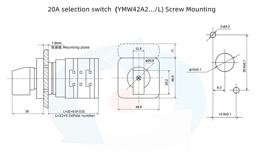 - Cấu hình lớp và định vị linh hoạt: Công tắc cam điều khiển nguồn kép ba vị trí 20A hỗ trợ nhiều góc định vị, bao gồm 30°, 45°, 60°, 90° và có thể có tối đa 12 vị trí vận hành và 1–12 lớp công tắc. Các góc định vị và cấu hình lớp khác nhau có thể được lựa chọn theo yêu cầu điều khiển thực tế.