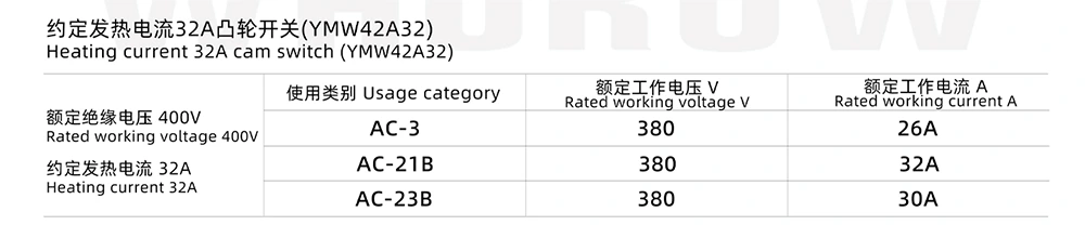 Công tắc cam gắn thanh ray ba vị trí YAMING 32A được thiết kế với hiệu suất kết cấu tuyệt vời, với các thông số chính sau: